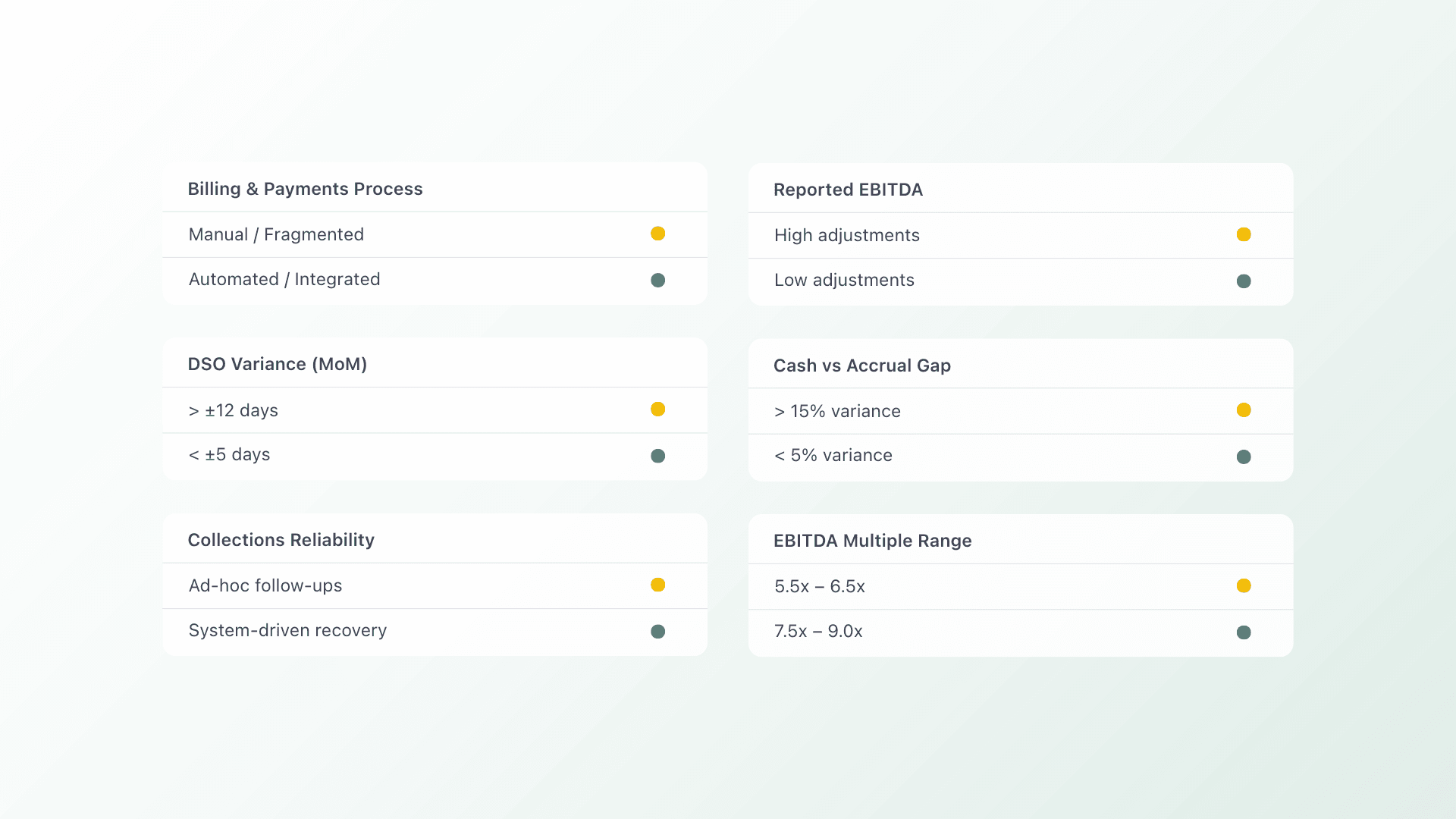 While private equity firms don’t publish formal diligence checklists, commonly used diligence frameworks and operating reviews routinely assess back-office automation and financial infrastructure alongside traditional risk factors such as revenue concentration, client retention, and margin durability. These elements signal how scalable, and how defensible, the business truly is.