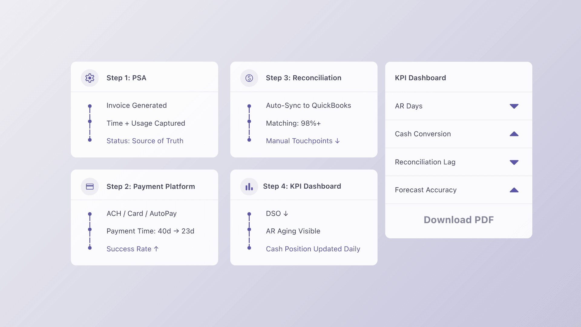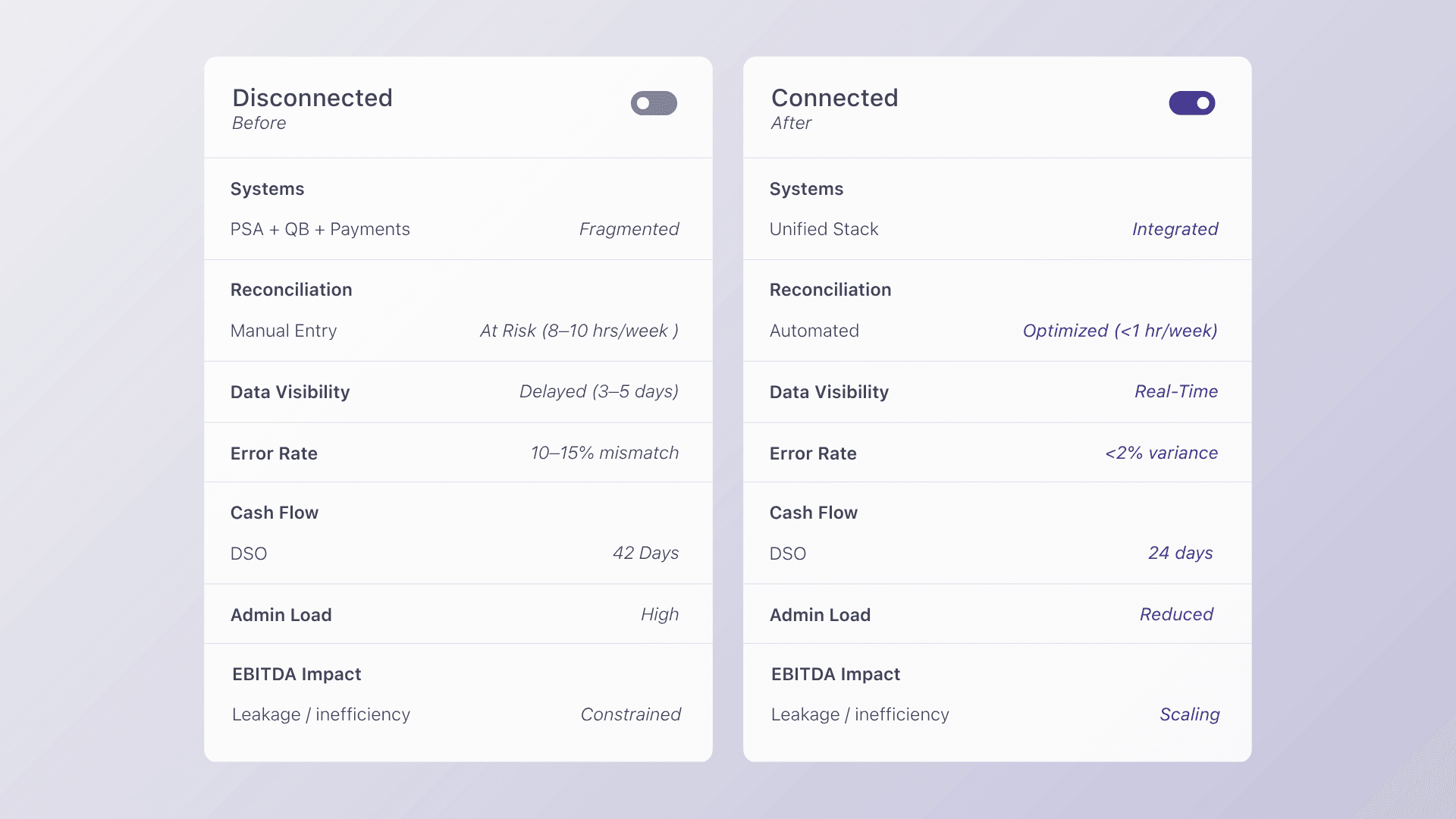 PSA to accounting syncs often break during updates, creating manual re entry and reconciliation gaps. Payment data lives across multiple systems, including PSA tools, QuickBooks, and payment platforms, without a single source of truth.