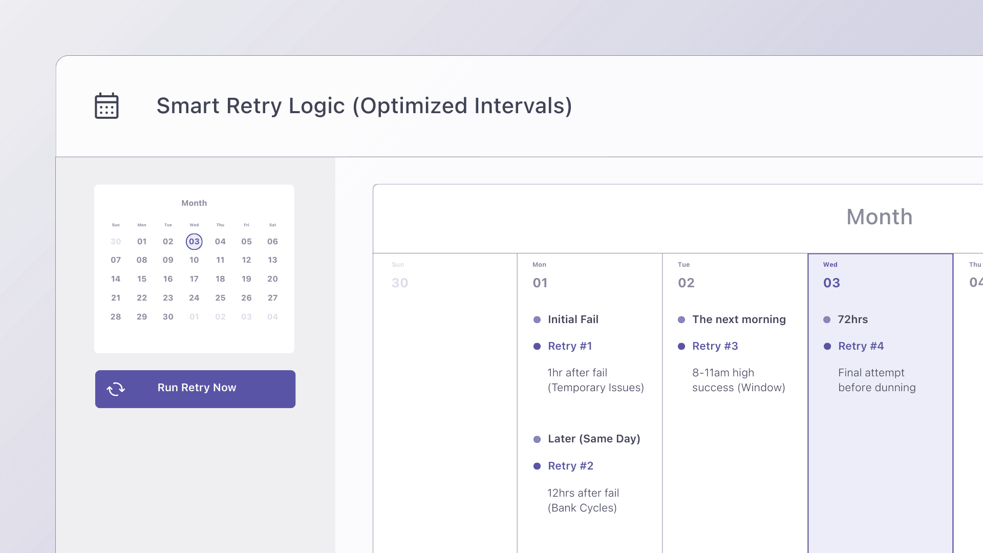Recent data support this. Recurly found that intelligent retry strategies can improve recovery by up to 43 percent. Morning attempts between 8 and 11 tend to work best, and mid-week retries usually outperform weekends. Late-night attempts often trigger needless fraud declines. Spacing out retries at intervals like 1 hour, 12 hours, 24 hours, and then 72 hours aligns better with how banks process transactions.