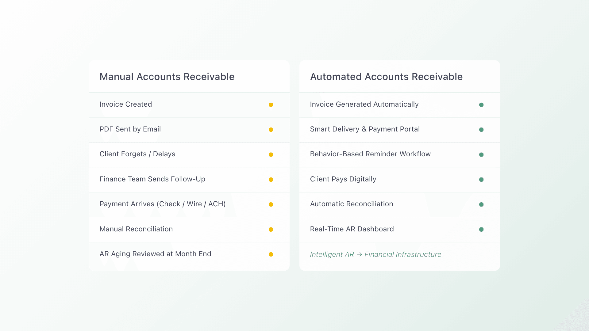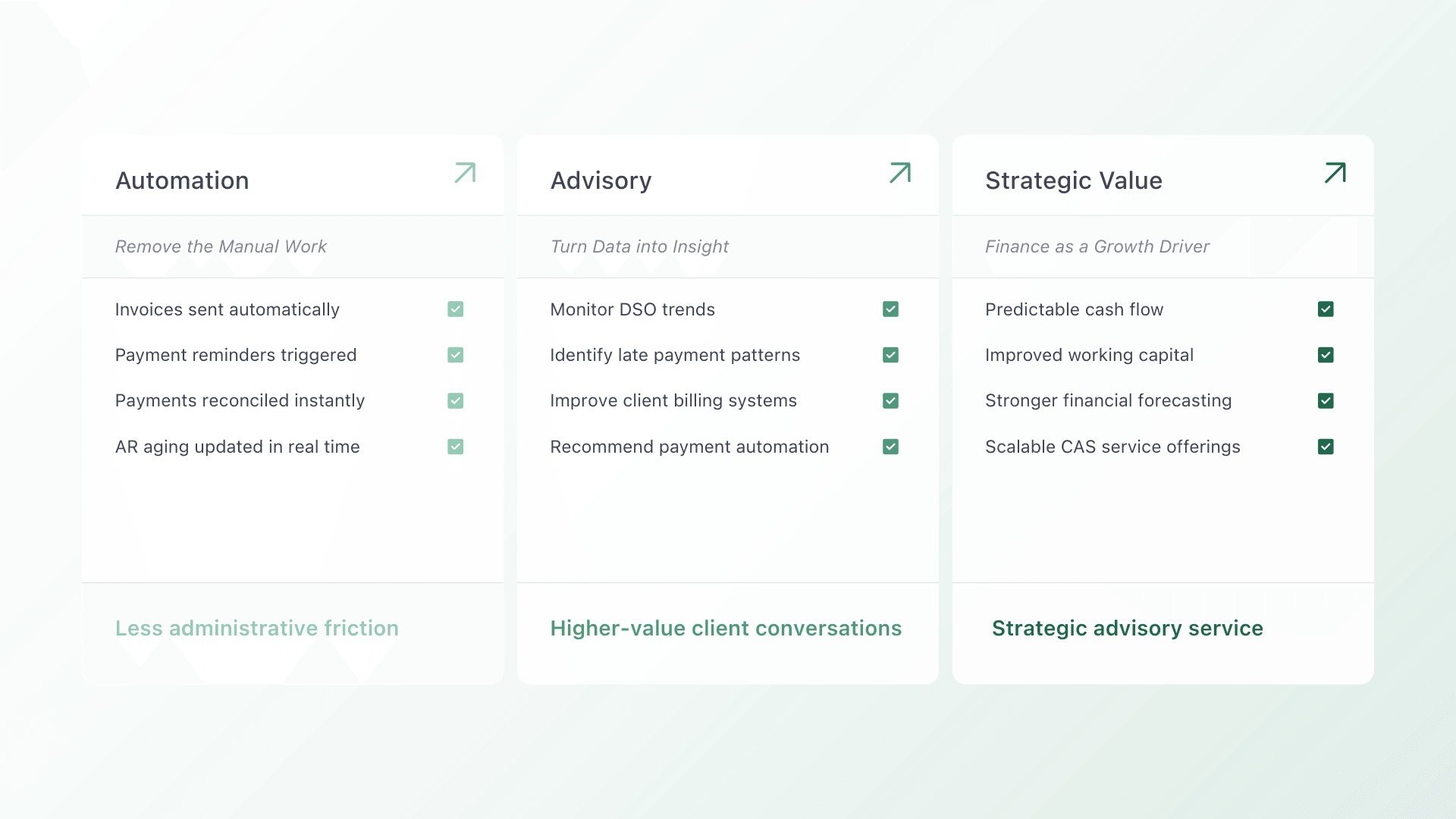 For accounting and CAS firms trying to build standardized, scalable services, that level of unpredictability creates operational friction. Chasing payments, reconciling transactions across disconnected systems, and managing inconsistent client payment behavior turns AR into a clerical burden rather than a strategic service.
