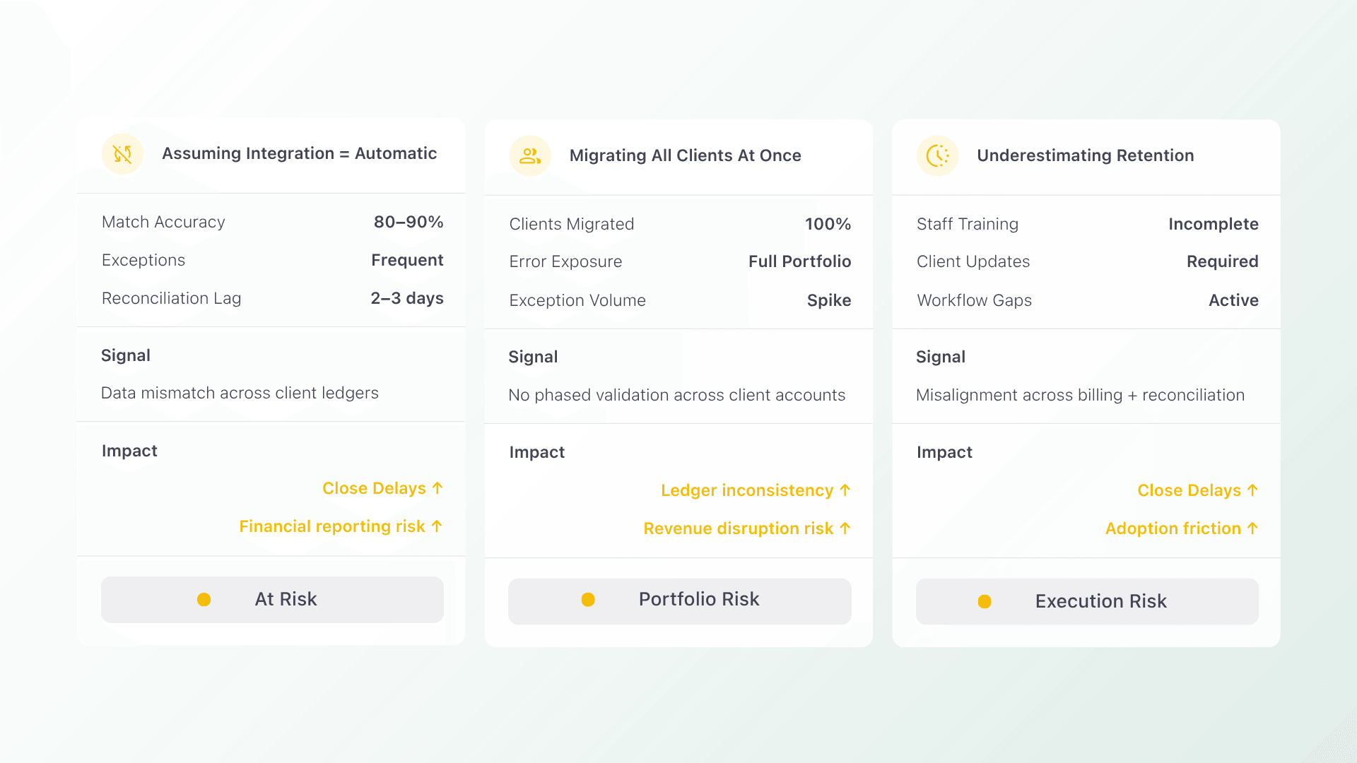 Rolling out a new payment platform across your entire book simultaneously removes your ability to catch and fix issues in a controlled way. A phased approach starting with 10 to 20 clients first gives you the room to resolve configuration gaps before they reach your full client base.