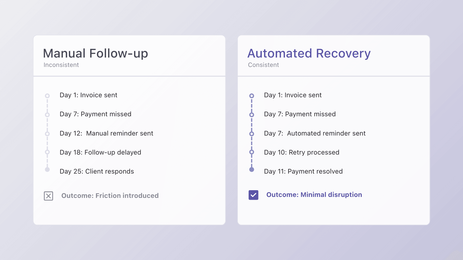 The longer recovery depends on ad hoc follow-up or reactive escalation, the more likely a correctable payment issue turns into a trust issue. The solution is not applying more pressure, but responding earlier and more predictably. When retries, reminders, and recovery steps follow a defined cadence, issues surface while context still exists. Clients experience support instead of surprise.