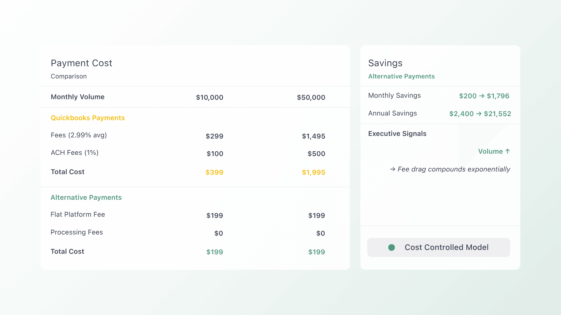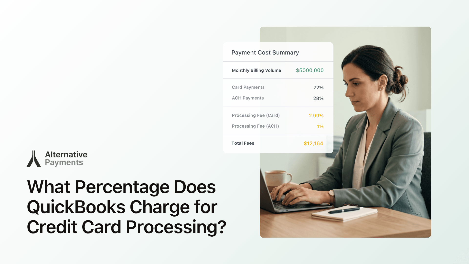 A: QuickBooks Payments charges 2.99% for online invoice payments, 2.5% for swiped or tap to pay transactions, and 3.5% for keyed in card entries (Intuit, 2025). Firms looking to reduce per transaction costs can use Alternative Payments, which operates on a flat monthly fee with no credit card processing percentage.