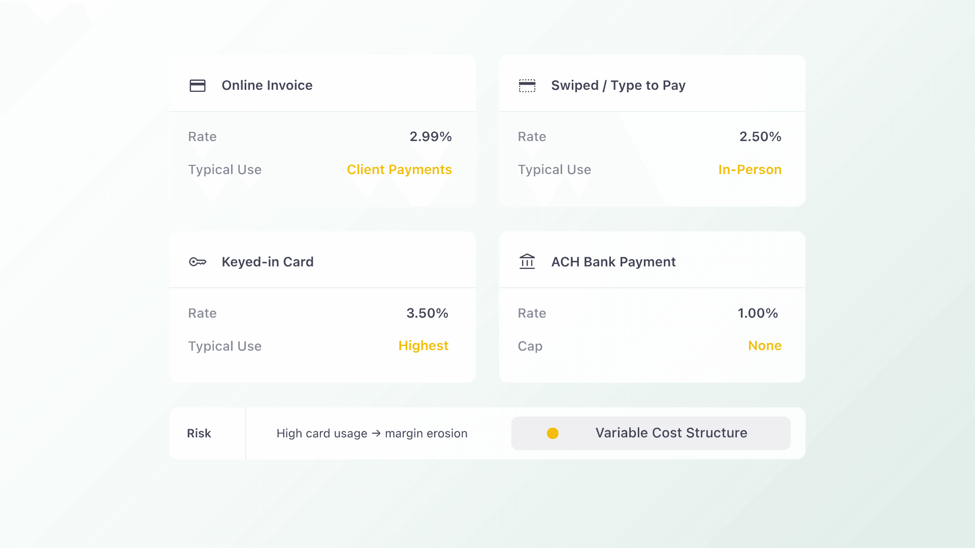 - Payment method. Online invoices via QuickBooks cost 2.99%, swiped payments 2.5%, and keyed in entries 3.5%. The channel determines the base rate.