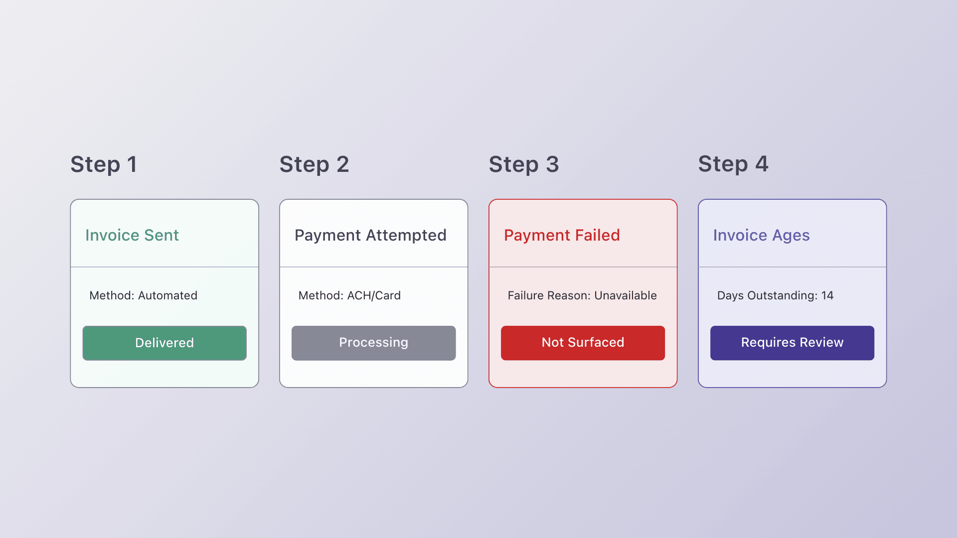 - Payment failures are not surfaced clearly, forcing reactive follow-up